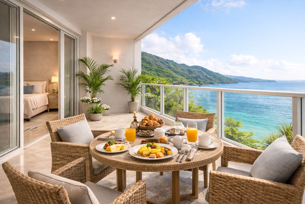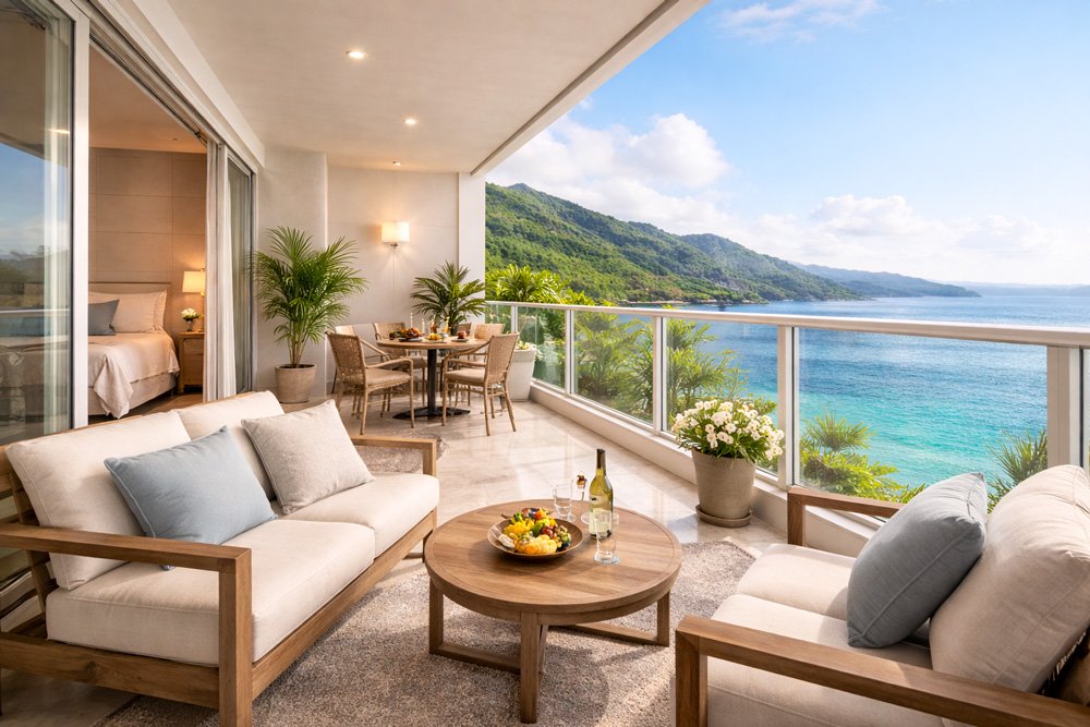 Inside, guests will find a comfortable king-size bed, modern décor, and a well-organized living space that combines style with functionality. Whether you are enjoying the fresh sea breeze on the balcony or unwinding indoors, every detail is designed to provide maximum comfort.
